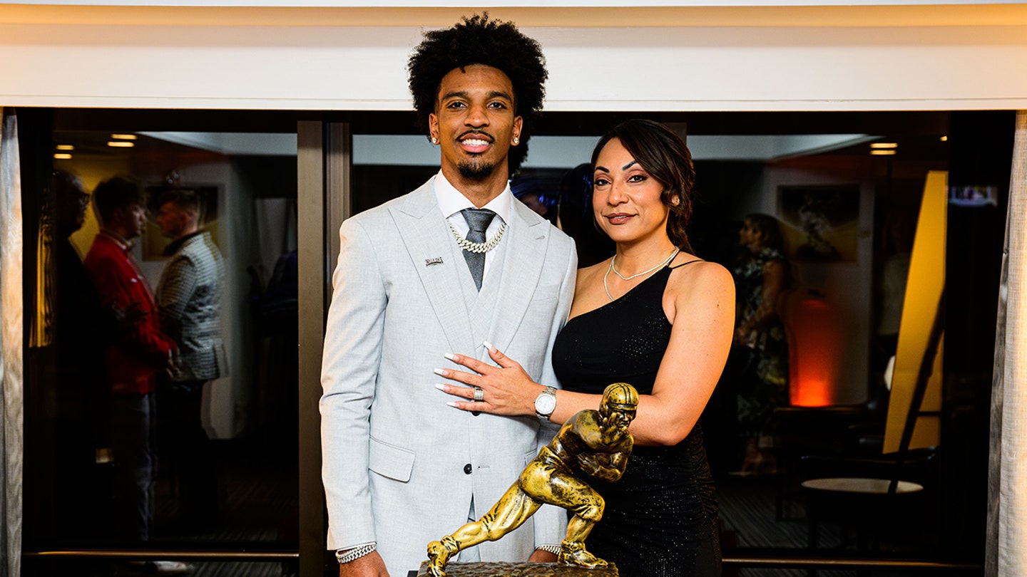 Quarterback Jayden Daniels of the LSU Tigers and his mother pose with The Heisman Memorial Trophy on Dec. 9, 2023, in New York City. (Gus Stark/LSU/University Images via Getty Images)