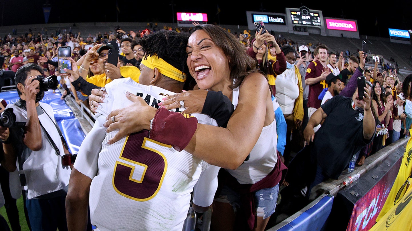Regina Jackson, mom of Jayden Daniels of the Arizona State Sun Devils, celebrates a 42-23 win over the UCLA Bruins at Rose Bowl on Oct. 2, 2021, in Pasadena, California. (Harry How/Getty Images)